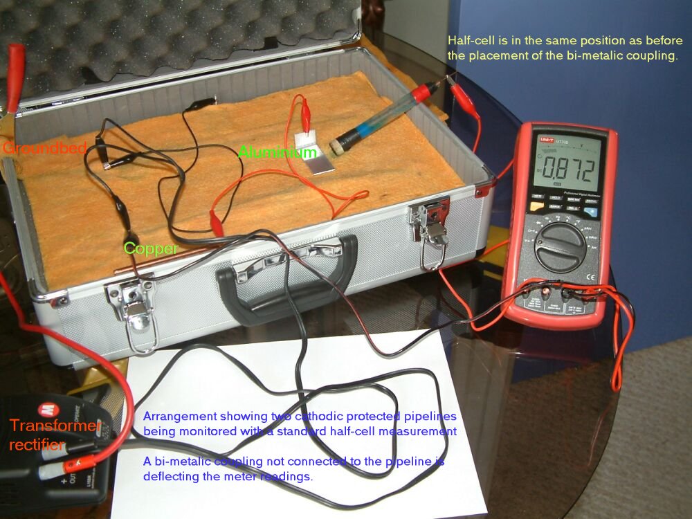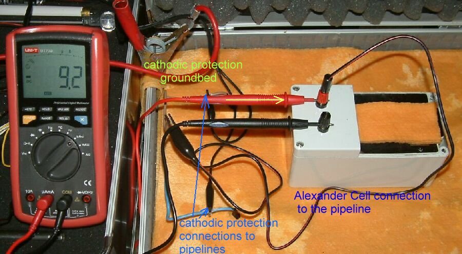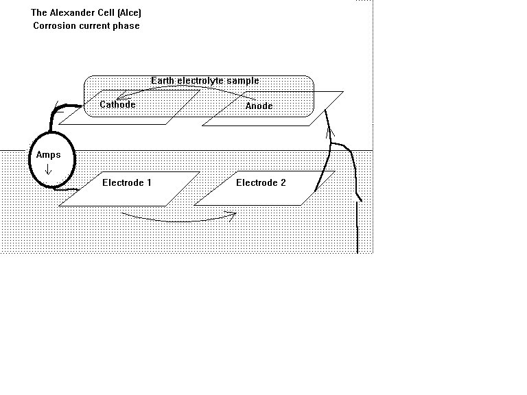The circuit of the Alexander Cell includes an earth path which allows the whole corrosion cell to be influenced by the current, locally available from the cathodic protection system. The effect of this influence can be seen on a current meter in a closed circuit condition.