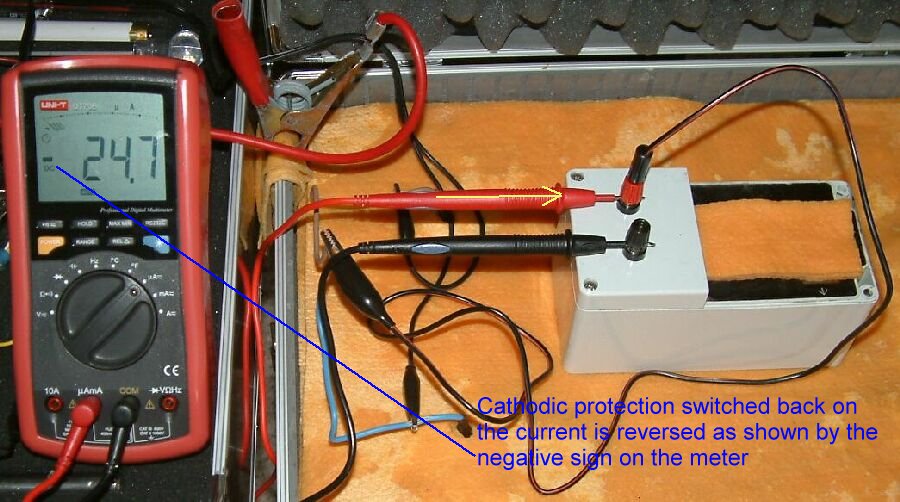 As the corrosion reaction is the sole cause of the original reading on the meter, then it may be safely reasoned that the reaction has stopped when this current has stopped.