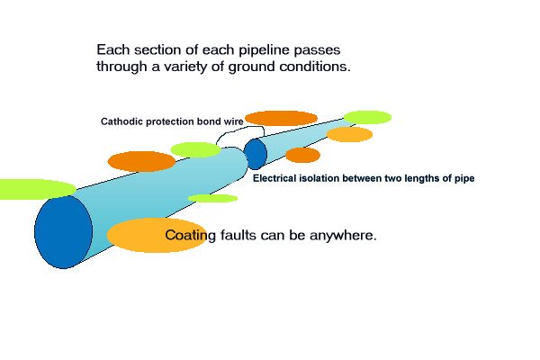 Pipelines are sectionalised, with isolation joints, to enable some control of the protective current, but each section will include many interfaces between the metal and the electrolyte.