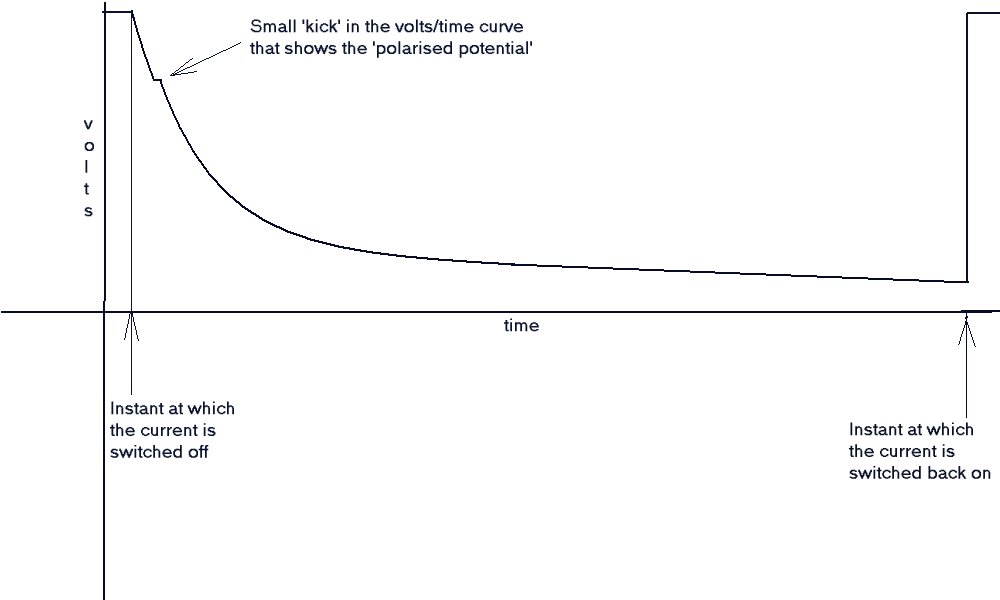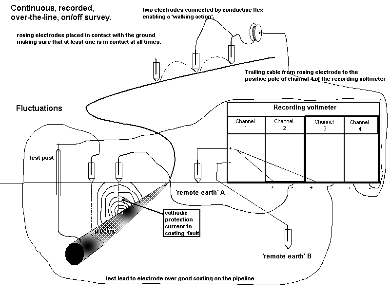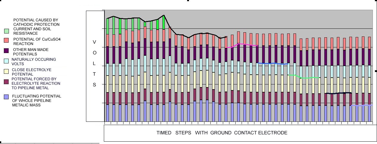 The bottom trace shows the similar potential differences when the impressed current is switched off and is losing it's influence on the total equillibrium between the ground (at that point of contact) and the whole of the pipeline with all it's coating faults.