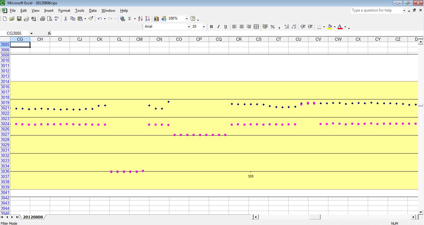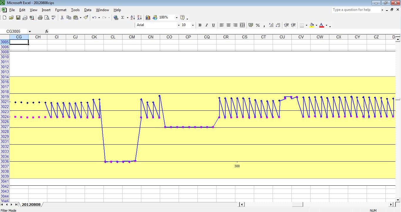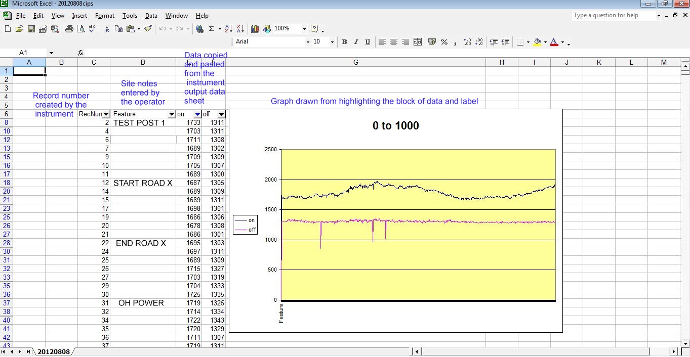 A close interval 'potential' survey should therfore be called a close interval VOLTAGE survey. The data is measured in voltages and these are first viewed on a spread sheet together with information about the exact time and GPS location at which each voltage was measured. There is a column into which the field operator can write notes and 'function keys' are normally provided to tell the instrument where to place other information and how to treat it within the spread sheet.